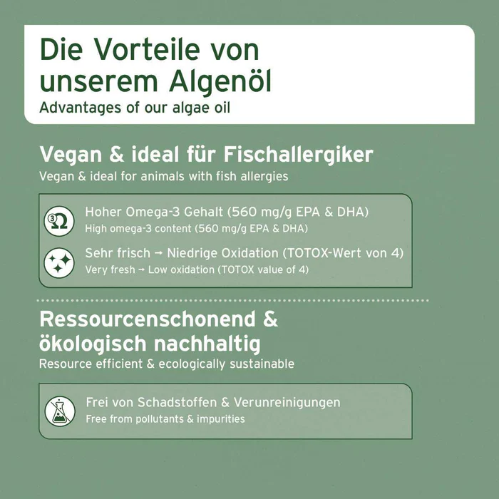 Algolja är dessutom fri från fiskprotein, har neutral smak och lukt och är därför ett bra val för hundar med känslig mage, fiskintolerans eller när man vill ha en ren och lättdoserad omega-3-källa.