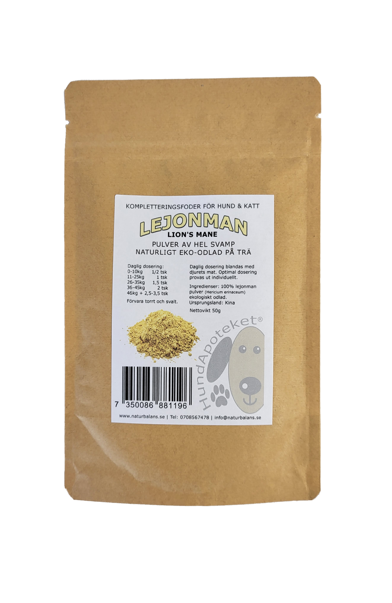 I HundApoteket Lejonman får du hela svampen, som odlats på trä i en ekologisk process, precis som den växer i naturen. Och det är hela svampen som torkats och malts till fint pulver.